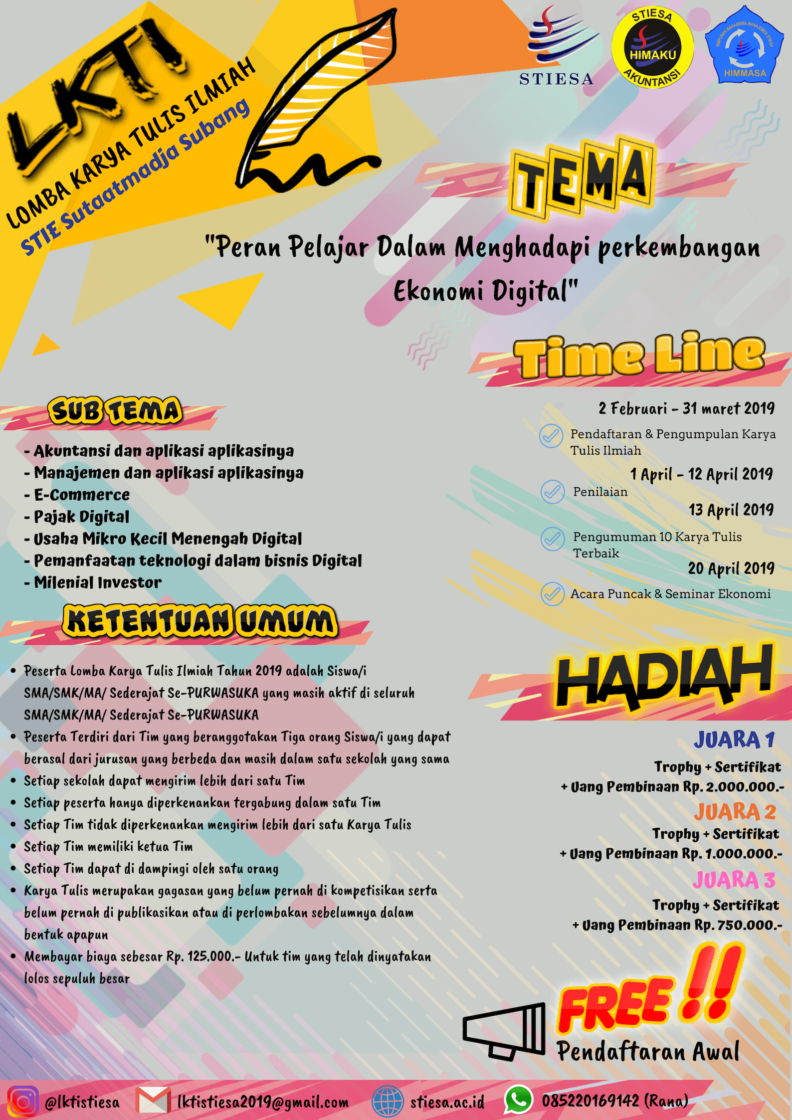 Lomba Karya Tulis Ilmiah (LKTI) adalah salah satu program kerja organisasi yang ada di STIE Sutaatmadja Subang, yaitu Himpunan Mahasiswa Akuntansi (HIMAKU) dan Himpunan Mahasiswa Manajemen Stiesa (HIMMASA) angkatan ke-19. Karya Tulis Ilmiah merupakan tulisan atau laporan tertulis yang memaparkan hasil penelitian atau kajian suatu masalah oleh seseorang atau kelompok dengan memenuhi kaidah dan etika keilmuan.