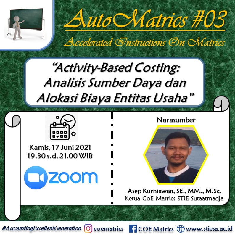 Berlangsung pada kamis 17 Juni 2021, kegiatan Auto Matrics #3 diisi oleh Bapak Asep Kurniawan, SE.,MM.,M.Sc. Tema kegiatan Auto Matrics kali ini adalah “Activity-Based Costing : Analisis Sumber Daya dan Alokasi Biaya Entitas Usaha”.