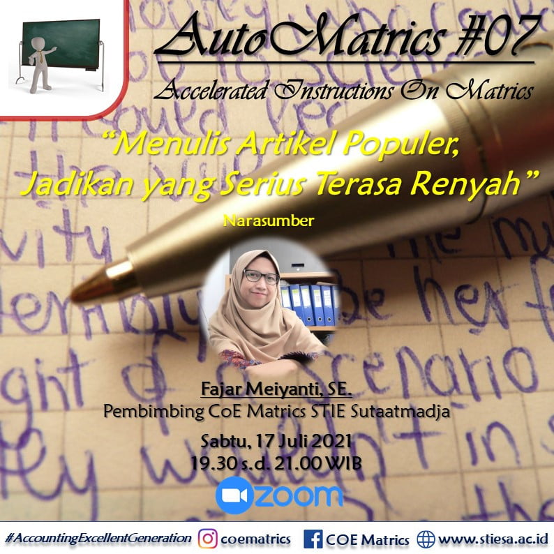Kegiatan Auto Matrics merupakan workshop rutin yang diselenggarakan oleh salah satu pusat keunggulan STIE Sutaatmadja, yakni COE Matrics.